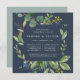 Unser Eukalyptus Grove Probe Dinner lädt Sie in einem einzigartigen quadratischen Format ein, Ihre Zeremonie-Probe und Dinner-Details mit Aquarell Eukalyptusblättern, grünen Blätter und winzigen marineblauen Knospen auf einem rauchblauen Hintergrund zu gestalten. Eine moderne und Bio Wahl für Herbst- und Winterabende mit frischem botanischem Grün und elegantem Schriftzeichen.