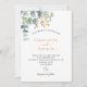 Ein schick weißer Hintergrund. Dekoriert mit grünen Aquarellen Eukalyptusbäumen, Blätter, Grünpflanzen und einem goldenen Imitat. Personalisieren und fügen Sie Ihre Namen und Hochzeitsdetails. Schwarze Buchstaben. Zurück: grüne Hintergrundfarbe.