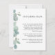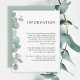 Ein schönes Aquarellbild Eukalyptus im Grünen hebt diese moderne Hochzeitsinformationskarte hervor, mit der Sie Ihre Hochzeitsgäste mit Details, Hotelunterkünften, Ihrer Hochzeitswebsite oder anderen nützlichen Informationen rund um Ihre Hochzeit versorgen können. Personalisieren Sie den Beispieltext, der in der Textvorlage angezeigt wird, mit den gewünschten Details. Diese Karten können als Gehäuse mit Ihrer Hochzeitseinladung geschickt werden. In diesem Design steht Ihnen eine Reihe von passenden Büroartikeln zur Verfügung, um Ihre Hochzeit oder Veranstaltung im schönen Stil zu koordinieren.