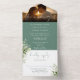 Alles in einer Eukalyptus-grünen Hochzeitseinladung mit Blumengrün, eleganter Kalligraphie-Schrift Typografie und Ihrem besonderen Foto. Die Einladung enthält eine perforierte RSVP-Karte, die für Sie individuell adressiert oder links als leere Karte für die Handschrift der Adressdaten Ihres Gastes verwendet werden kann. Entwickelt von Thisisnotme©