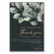 Mit dieser raffinierten Dankeschön-Karte mit einem atemberaubenden Eukalyptusfoliage-Design bedanken Sie sich stilvoll. Die Worte "Danke" sind wunderschön in einem luxuriösen, handgeschriebenen Stil geschrieben und vor dem dunkelgrünen Hintergrund stehend. Unter der eleganten Schrift wird eine persönliche Dankesbotschaft in einem zeitlosen Serif-Schriftart angezeigt, der Ihren Gästen Platz für herzliche Worte bietet. Die gedämpften Eukalyptus-Blätter mit ihren sanften grünen Farbtönen und goldenen Akzenten verleihen dieser Karte eine natürliche Eleganz und machen sie zu einer perfekten Mischung aus modernem Raffinesse und Bio Schönheit.