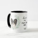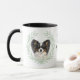 "ICH LIEBE MEINEN PAPILLON-HUND" verkündet dieser Becher für den Besitzer eines Papillon-Hundes. Jede Seite des Bechers zeigt ein Porträt eines süßen kleinen schwarz-weißen Papillons, umrahmt von weichen grünen Eukalyptusblättern in Wasserfarben. Zwischen den beiden Bildern befindet sich der Text, der leicht angepasst oder sogar entfernt werden kann, sowie Ihr Monogramm oder Name.