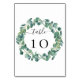 Ein eleganter weißer Hintergrund mit einem eukalyptusgrünen Kranz. Personalisieren und Ihre Tischnummern. Schwarze Buchstaben.