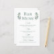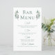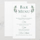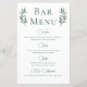 Ein schlicht elegantes, grünes Kalligraphieskript mit zwei Aquarellfarben-Eukalyptus-Blätter auf beiden Seiten oben um den Titel des Bar-Menüs. Ein schönes, minimalistisches Herbstgetränk-Menü mit einer detaillierten Liste von Wein, Bier, Spirituosen und alkoholfreien Getränken. Die schicke, moderne Hochzeitsdekoration des Abends für einen Gartenabend.
