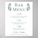 Ein schlicht elegantes, grünes Kalligraphieskript mit zwei Aquarellfarben-Eukalyptus-Blätter auf beiden Seiten oben um den Titel des Bar-Menüs. Ein schönes, minimalistisches Herbstgetränk-Poster mit einer detaillierten Auswahl an Wein, Bier, Spirituosen und alkoholfreien Getränken. Die schicke, moderne Hochzeitsdekoration des Abends für einen Gartenabend.