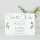 Ein schlicht elegantes, grünes Kalligraphieskript mit zwei Aquarellfarben-Eukalyptus-Blätter auf beiden Seiten unten, um diese schöne, minimalistische fallweise Save the Date Karte zu dekorieren. Eine schöne, moderne Hochzeitssuite für Abende für einen Gartenabend.
