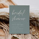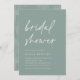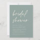 Erleben Sie die Braut mit den modernen und minimalen Brautduscheinladungen. Einfaches Design mit "Brautparty" in lässiger handgeschriebener Schrift auf einem weichen eukalyptus grünen Hintergrund, mit Ihren Veranstaltungsdetails ausgerichtet an den unteren links in modernen off white Lettering. Ein dezentes, tonales Palmenblattmuster auf der Rückseite rundet das Design ab.