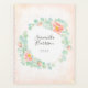 Moderne Aquarellkunst mit Eukalyptus-Zweigen mit reichhaltigem Blattwerk kombiniert mit pfirsichrosa Pfannkuchen, die einen schönen Blumenkranz bilden. Anpassbare Bezeichnung und Jahr in einem extravaganten Rahmen. Weiche Pastellfarben, Pfirsich, Salbei, hellgrün, Jade, Creme, Rosa, Rosa rot, hellorange, Korallen. Blotchy Wasserfarbe fällt auf den Hintergrund. Großartiges personalisiertes Geschenk.