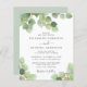 Eine preisgünstige und elegante Hochzeitseinladung mit Aquarellen aus Weiß-grünem Eukalyptus-Grün mit Goldakzenten, stilvollem Drehbuch und weicher grauer Typografie. Geben Sie Ihre Hochzeitswebsite-Adresse ein, um einen skalierbaren QR-Code für Ihre Gäste zu erstellen, um online UAWG zu erhalten und Informationen über alle Details wie Anfahrtsbeschreibung und Unterkunft zu erhalten.