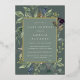 Eine schicke, geschlechtsneutrale Babydusche mit üppig grünen botanischen Blätter und Eukalyptusblättern in Aquarellfarbe mit Goldfolienbesatz. Persönlich mit Ihrem Baby Duschdetails in modernen Schriften auf einem Ton moosgrünen Hintergrund.