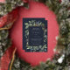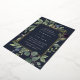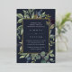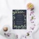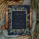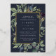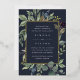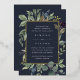 Elegante botanische Hochzeitseinladung umrahmt Ihre Hochzeitsfeierlichkeiten mit einem Rand von Aquarellfarben Eukalyptus-Blätter, blauen Blumen und grünem Blattwerk auf einem marineblauen Hintergrund. Luxe Goldfolienbespannung rundet das Design ab.