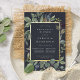 Die schicke botanische Probe-Dinner-Einladung zeigt eine Grenze von üppig grünen botanischen Blätter und Aquarell eucalyptus foliage mit Goldfolie. Persönlich gestalten Sie Ihre Zeremonie mit Probe und Abendessen in modernen Schriften auf einem reichen Mitternachtsblauen Hintergrund.