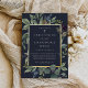 Die schicke botanische Einladung für Taufen, Taufen oder Babyweihungen umfasst eine Grenze zwischen üppig grünen botanischen Blätter und Eukalyptusblättern in Aquarellfarbe mit Goldfolien. Personalisieren Sie Ihre Zeremonie und Ihre Party Details in modernen Schriften auf einem reichen Mitternachtsblauen Hintergrund.