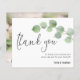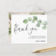 Ein Preis SMALLER 4,5" x 5,6" Alternative. Erhältlich in einem SEMI-GLOSS 110 lb CARD STOCK, der die Standardoption (dicker für Einladungen) ist, ODER einem SATIN FINISH 80 lb THINNER PAPER STOCK (ideal für Gehäuse). Umschläge sind optional und etwas größer als die Kartengröße. Ein eleganter Goldzweig grüner Eukalyptus-Blätter fließt teilweise von der rechten Seite über den rechten, mit Set-Typografie Dankeschön in einem modernen Drehbuch zur links Seite. Auf der Rückseite, tauschen Sie Ihr Lieblings-Foto aus Ihrem Tag (der Landschaft orientiert). Die Erholung des Textes auf der Vorderseite können Sie leicht nach Ihren eigenen Worten personalisieren. Sie interessieren sich auch für unsere handlichen individuellen Gästennamen- und Adressenaufkleber in dieser Sammlung, um Ihre Hochzeitsmailings zu unterstützen.