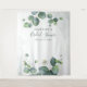 Eukalyptus Verlasst den Stand des Greenery Foto Booth. Großartige Wanddekoration aus Party und Banner für ein trendiges modernes botanisches Brautparty. Mit grünem Eukalyptus mit Aquarellrot-Hintergrund. Ändern Sie einfach die Details, indem Sie oben auf die Schaltfläche "Personalisieren" klicken.