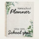 Einfache und schicke Eukalyptusblattdecke mit antikem weißem Hintergrund. Planer für das ganze Schuljahr.