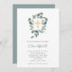 Diese einfache und trendige, geschlechtsneutrale Taufe oder Weihnachtseinladung enthält grüne Eukalyptusfarben-Blätter, die ein Wappen mit einem Imitat-Goldkreuz in der Mitte auf einem weißen Hintergrund umgeben.