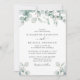 Elegante Einladung zur Hochzeit mit Aquarellen aus Weiß-Eukalyptusgrün, stilvollem Drehbuch und weicher grauer Typografie. Auf der Rückseite geben Sie Ihre Hochzeitswebsite-Adresse ein, um einen QR-Code für Ihre Gäste zu erstellen, um online zu scannen und zusätzliche Hochzeitsdetails wie Unterkunft und Anfahrtsbeschreibung zu erhalten.