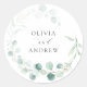 Mit diesen klassischen botanischen Hochzeitsaufklebern können Sie Ihre Einladungsumschläge oder Favoriten Siegel. Mit Ihren Namen gerahmt durch einen Aquarellkranz aus grünem Eukalyptusblättern. Anpassen mit Namen.