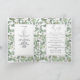 Eine wunderschöne handgezeichnete Aquarell Eukalyptusgrün und Kaugummi blüten Hochzeitsdesign. Ein einzigartiges Design, das illustrierte Aquarell Eukalyptus-Blätter und Blumenblüten botanischen Ursprungs verwendet. Ein modernes Eukalyptus-Blumendesign. Eine elegante Hochzeitsordnung des Service-Programm-Design mit modernen Elementen. Auch die passenden Hochzeitseinladungen und andere Schreibwaren sind verfügbar.