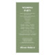 Dieses Hochzeitsfeier und Party-Programm des HAUSHALTSPLANS ist wunderschön gestaltet, mit einem weißen Rahmen und einem schlauen grünen Rahmen auf der links Seite, was ihm eine elegante Touch verleiht. In der oberen links Ecke befindet sich ein zarter Ast des Eukalyptus, der mit weißen Blume geschmückt ist und dem Gesamtbild ein natürliches und romantisches Element hinzufügt. Der Text wird in fett formatierter Typografie hervorgehoben, wodurch er sich herausstellt und leicht lesbar ist. Die Rückseite des Programms ist eine beruhigende Weise grün Farbe, die das gesamte Aussehen nahtlos zusammenbindet.