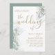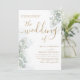 Dies ist eine moderne und elegante "Hochzeit der" kalligraphischen Hochzeit Einladung in Gold auf einem weißen Hintergrund mit der Zugabe von Salbei grünen Eukalyptus und koordinieren botanische Elemente. Einfach den Text anpassen, um etwas wirklich Einzigartiges zu schaffen.