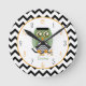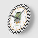 Eine Uhr, die eine Illustration eines grünen Monsters inspiriert Eule zeigt. Der Hintergrund ist Zickzack schwarz-weiß. Personalisieren Sie mit Ihrem Namen. Suchen Sie nach passenden Artikeln in Jill's Paperie.