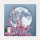 Ein Gemälde einer Barnschale, die auf dem blühenden Baumzweig eines Obstbaumes steht, mit Vollmond im Hintergrund. Artwork Copyright ©2018 Kimberly J Tilley.