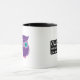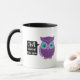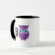 Eulen-immer Liebe Sie süße lila Eulen-Cartoon-Tasse. Lila, aquamarin, Lavendel und rosa Eule sagt "EULEN-IMMER LIEBE SIE" in einer Schwarzweiss-Wortblase. Entwurf auf beiden Seiten von dieser Spaß-Tasse. Großes Geschenk für Eulenliebhaber.