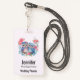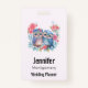 Ein Namensschild mit dem Bild eines Eulenpaares in der Liebe, das auf einem Zweig sitzt. Umgeben von hübschen blauen, grünen und rosa Blumen.