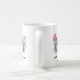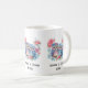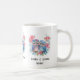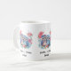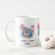 Eine Tasse mit einem Eulenpaar in der Liebe, die auf einem Baumzweig zusammensitzen. Umgeben von hübschen blauen, grünen und rosa Blumen.