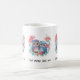 Eine Tasse mit einem Eulenpaar in der Liebe, die auf einem Baumzweig zusammensitzen. Umgeben von hübschen blauen, grünen und rosa Blumen. Im Text steht "OWL immer LIEBE" niedlicher lustiger Pun für romantische Events oder Valentinstag.