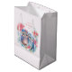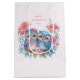 Ein Valentinstag-Geschenksack mit dem Bild eines Eulenpaares in der Liebe, das auf einem Zweig sitzt. Umgeben von hübschen blauen, grünen und rosa Blumen.