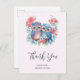 Vielen Dank, dass Sie eine Postkarte mit einem Bild von einem Eulenpaar in der Liebe haben, das auf einem Baumzweig zusammensitzt. Umgeben von hübschen blauen, grünen und rosa Blumen.