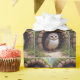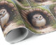 Zwei Eulen stehen am Eingang eines gemütlichen, mit Grünpflanzen geschmückten, steinernen Bogens, umgeben von Wildblumen