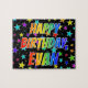 This exciting and vibrant birthday-themed jigsaw puzzle design has the message "HAPPY BIRTHDAY, EVAN" with the characters having a colorful rainbow spectrum inspirred gradient pattern, along with a fun star shapes background pattern. In Colorful Puzzle Like This Might be hat man ein Way to Send Birthday wishes to somebody named Evan. [~ Z0000468]