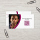 Ein bordeauxrotes Set des Fotos in diesem Visitenkartendesign mit einem Foto-Platzhalter auf der links Seite mit Vorlagenname, Titel und QR-Code auf der rechten Seite. Auf der Rückseite befindet sich ein farblich koordiniertes Design mit Textfeldern für den Firmennamen und die Details. Ersetzen Sie das Platzhalter-Foto durch Ihr Foto im vertikalen Format und Ihren QR-Code auf der Vorderseite. Füllen Sie die Vorlagenfelder aus, entfernen Sie den Text oder bearbeiten Sie ihn mithilfe des Entwurfstools, um einen Schriftart auszuwählen, der Sie gerne haben. Verwenden Sie Ihren QR-Code, um Kunden auf eine Website, eine Empfehlungsseite, Fotos oder eine andere spezielle Seite zu schicken. Das Platzhalter-Foto ist gerne pixabay.com.