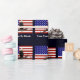 Ein Bald-Adler scannt den Himmel von seiner Terrasse auf einem Baumzweig, überlagert auf einer Fahne der Vereinigten Staaten. Fügen Sie Ihren eigenen Text hinzu.