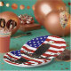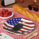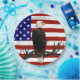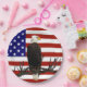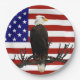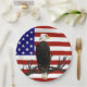 Ein Bald-Adler scannt den Himmel von seiner Terrasse auf einem Baumzweig, überlagert auf einer Fahne der Vereinigten Staaten.