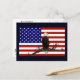 Ein Bald-Adler scannt den Himmel von seiner Terrasse auf einem Baumzweig, überlagert auf einer Fahne der Vereinigten Staaten.