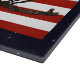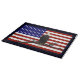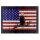 Ein Bald-Adler scannt den Himmel von seiner Terrasse auf einem Baumzweig, überlagert auf einer Fahne der Vereinigten Staaten.
