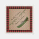 Papierservietten mit einer Abbildung von zwei immergrünen Zweigen und einem grünen Kanu. Personalisieren Sie den Text. Der Hintergrund ist rot und schwarz kariert. Suchen Sie in Jill's Paperie nach passenden Einladungen und anderen koordinierenden Gegenständen.