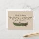Eine Hochzeit speichert das Datum Postkarte mit einer Abbildung von zwei immergrünen Zweigen und einem grünen Kanu. Personalisieren Sie den Text auf der anderen Seite.