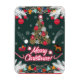 Das ist ein fröhliches Weihnachtsdesign mit goldenem Weihnachtsbaum, Weihnachtsbeleuchtung, Schneeflocken und dunkelgrünem Hintergrund mit tausenden Sternen.