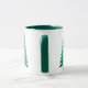 Tasse in einer klassischen Silhouette eines Weihnachtsbaumes in dunkelgrün / immergrün, gemustert mit geometrischen Schneeflocken in pastellgrün, aqua und eisblau