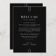 Dieser elegante, schwarze Hochzeitspaziergang aus der Everly Collection besticht durch knusprige Weißtöne, geometrische Deko-Akzente und redaktionelle Abstände. Die schlichten, dünnen Dreizeilentexte bilden einen eleganten Rahmen für ein raffiniertes, modernes minimalistisches, Abend-orientiertes Design. Auf der Vorderseite des Begrüßungstafels befindet sich ein Begrüßungsbrief und auf der Rückseite befindet sich die Zeitachse für die Hochzeitsreise. Diese Noten sind ideal für Hochzeiten in Urlaubsort und Begrüßungstaschen für Hotelgäste.