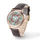 Rose goldene Frauenuhr. Die atemberaubende Frauenuhr ist mit Kupferponderosa-Nadeleconen aus Metall auf einem strukturierten grünen Hintergrund ausgestattet. Dieses Design basiert auf Handwerkerfliesen des Oregon Künstlers Fay Jones Day. Dies ist für Menschen, die Liebe Ponderosa pinecones oder Kunst und Handwerk Motive.