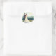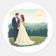 Enthält 20 kleine Aufkleber auf einem Blatt. Delikate Illustration eines Ehepaares in Hochzeitskleidung mit Händen, stehend auf einem malerischen Hügel mit Bergen und einer leuchtenden Sonne im Hintergrund, perfekt für die Dekoration zum Thema Hochzeit.