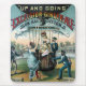 Circa 1885 - Werbung für Ginger Ale mit Ballon und Korb mit schwarzen Begleitern. Zwei Frauen trinken Excelsior Ginger Ale, was impliziert, dass der Kohlenstoff hilft der Ballon zu steigen. Bild von zwei modisch gekleideten Frauen in schlanken, langen Kleider und Knöcheln, die auf einer Heißluftballonfahrt starten, eine steht im Korb und hält ein spitzengeätztes Taschentuch mit einem senfliegenden Ballonfahrer mit Fernglas und einem Monokel, die andere sippt eine Insignatur aus Glas, während sie beginnt, eine Seilleiter in das Handwerk zu steigen; zwei afroamerikanische Männer mit Gale Ein großer Menschenmassen beobachtet das Spektakel hinter einem weißen Holzzaun, der mit Werbeslogans bemalt ist
