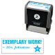 Dieses inspirierende Gummi-Briefmarke-Design zeichnet sich durch die positive Botschaft "EXEMPLARY WORK!" und einen benutzerdefinierten Tutor-Namen aus. Es verfügt auch über ein Symbol in Sternenform. Es könnte von einem Lehrer oder Erzieher verwendet werden, wenn er die Aufgaben markiert, um anzuerkennen, dass ein Schüler gut abgeschnitten hat.